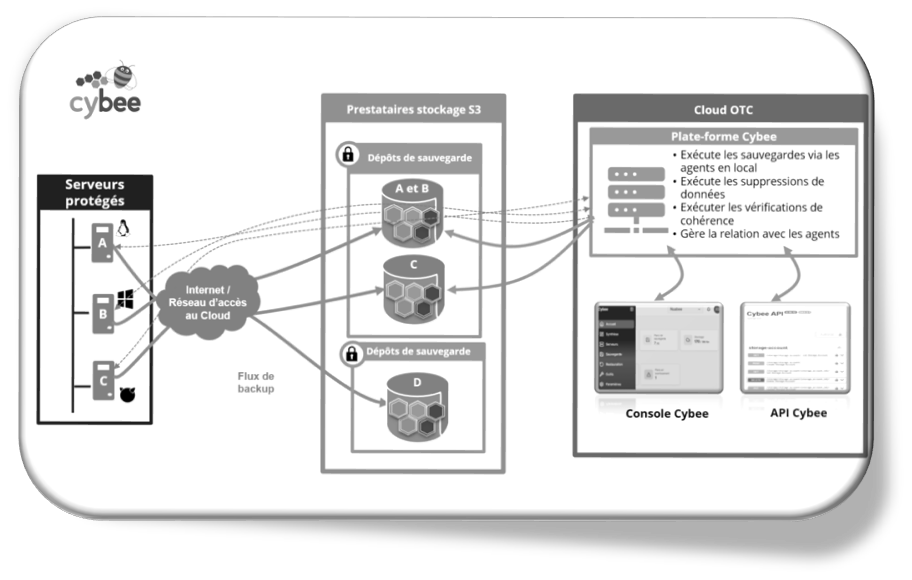 L’orchestrateur Cybee constitue la clef de voûte de la solution. Il gère intelligemment les tâches de sauvegarde pour garantir le respect de vos contrats de service (SLA), même avec des contraintes réseau importantes ou des fenêtres de sauvegarde limitées.