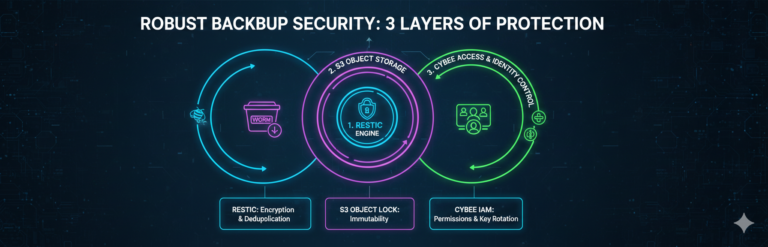 Cybee implémente ce mécanisme selon un pattern à deux niveaux : un bucket « actif » pour les opérations Restic courantes, et un bucket « coffre-fort » avec Object Lock activé, idéalement dans un compte séparé.